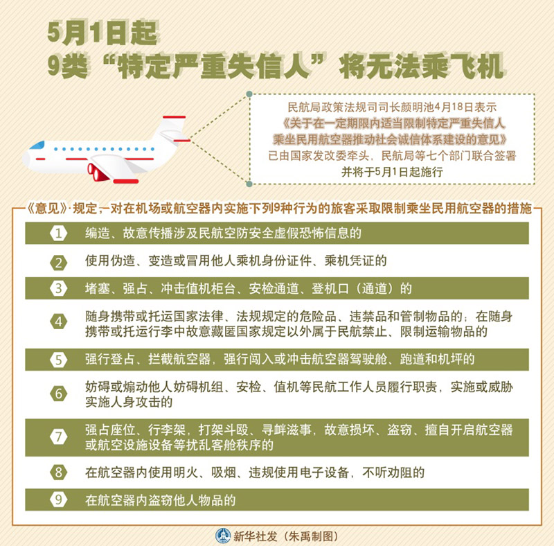 图表:5月1日起9类“特定严重失信人”将无法乘飞机